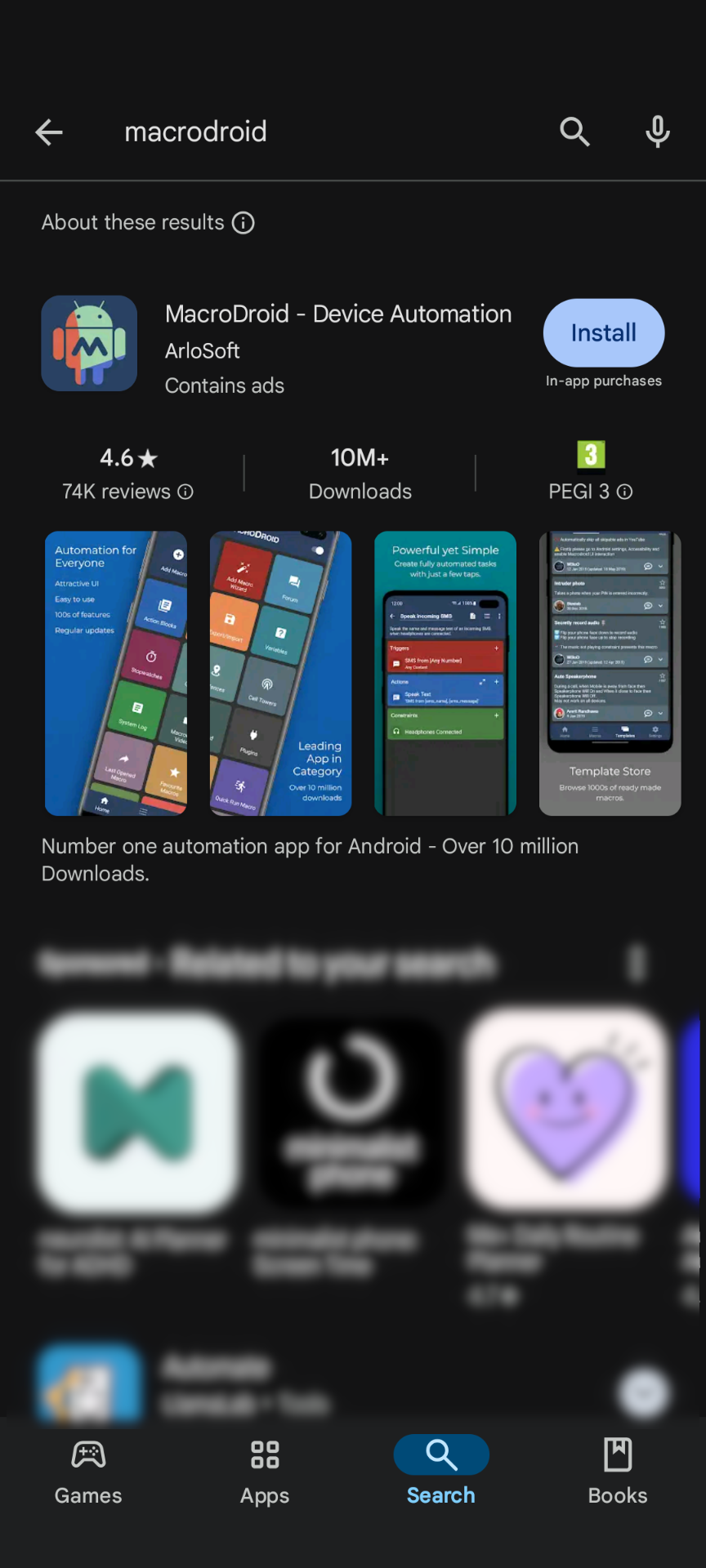 Install MacroDroid on your Android device. Please search for MacroDroid; this is the application that we are going to use. Again, I'm not affiliated with the company or the developer of this application, I just quite like that it's very simple to use, reliable, and it just works.