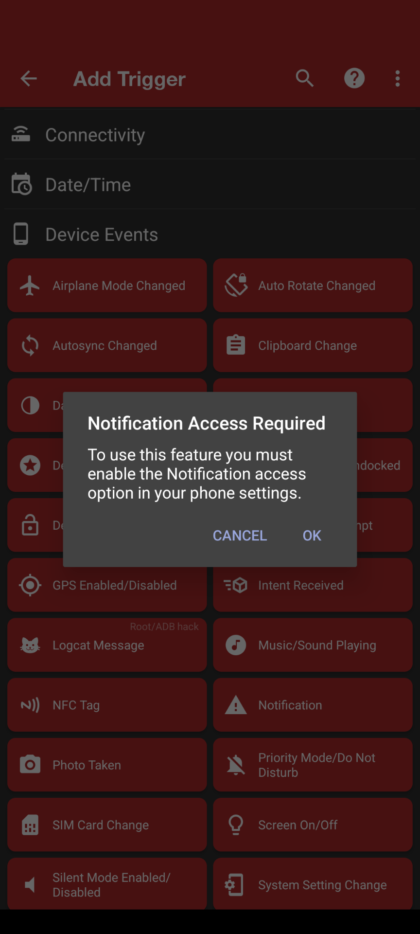In our case, the trigger will be a notification that comes from a certain application. For the first time, it indicates that if you have favorite triggers, they can be launched in a much more streamlined way. But let's just hit okay. Once again, for the first time, it explains what the trigger is.
