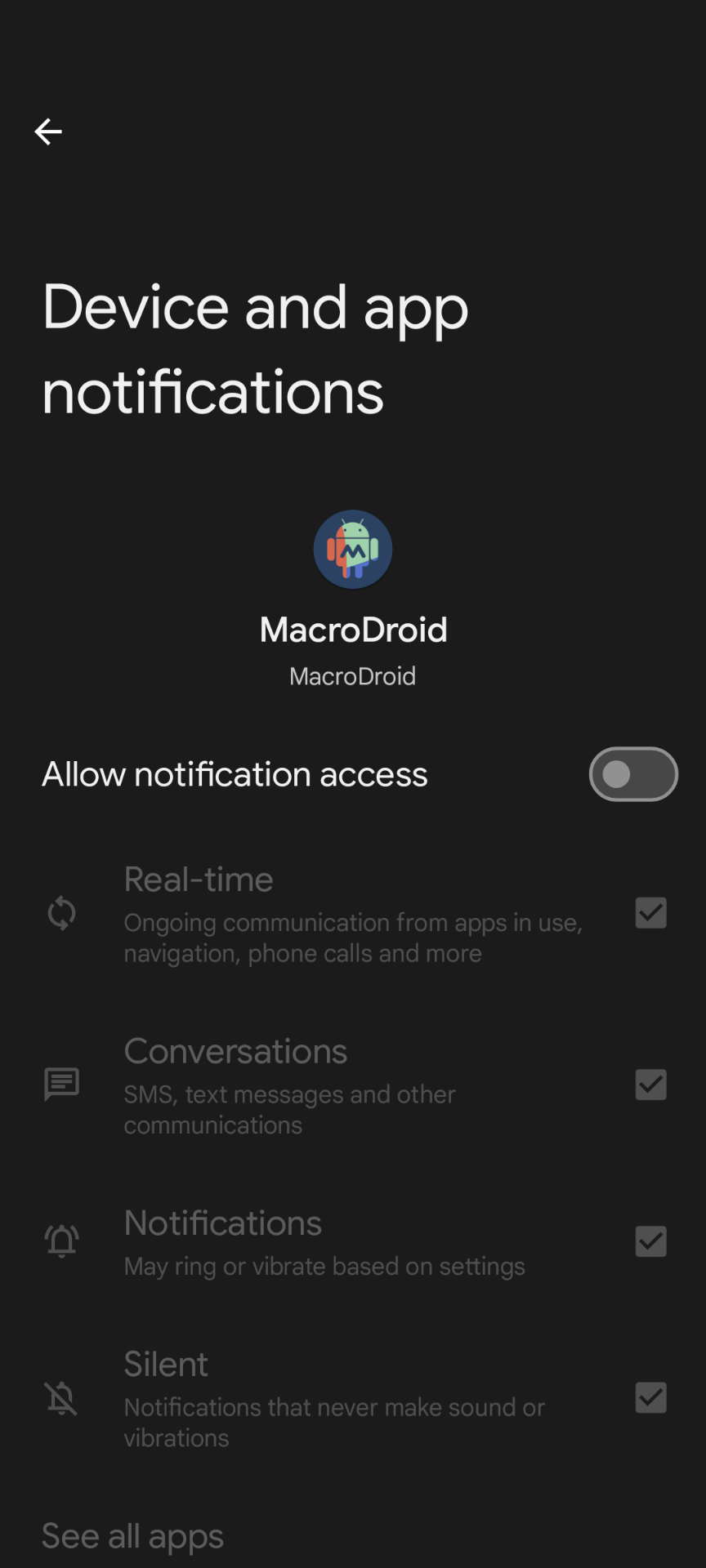 This takes us to our Android device settings, where you have to enable it. In order to do that, you have to allow certain permissions for MacroDroid.