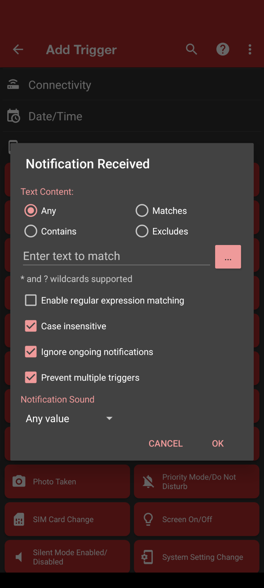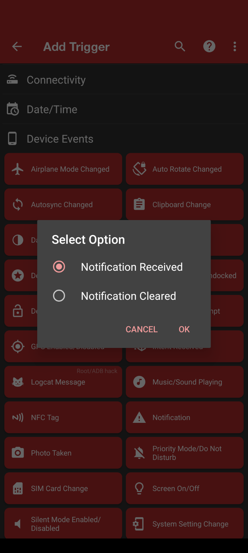 Here is the interesting part: this whole process begins here. It asks you, "Okay, you said notifications, but when exactly should this trigger be recognised?" Is it when a notification is received, when you dismiss a notification, or when you clear a notification? In our case, the trigger should be when a notification is received.