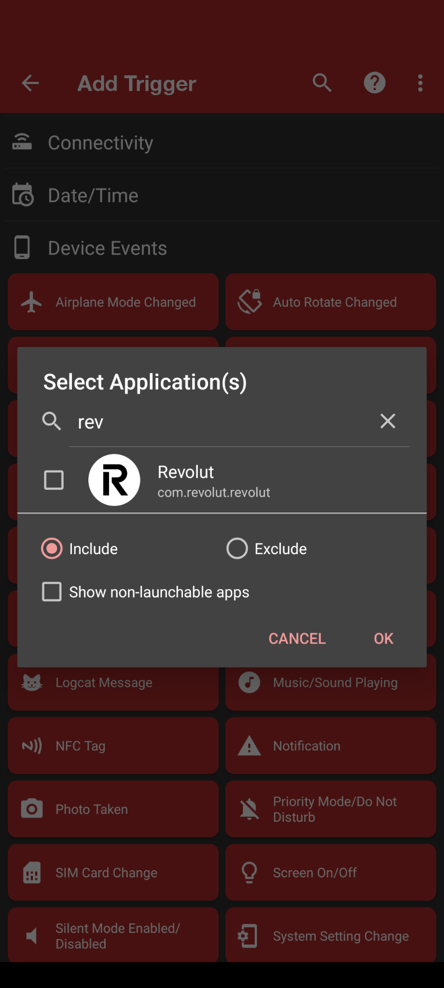 Very smartly, it says, "Okay, but please select the application or applications that can be used for this triggering step." In my example case, I searched for Revolut.
