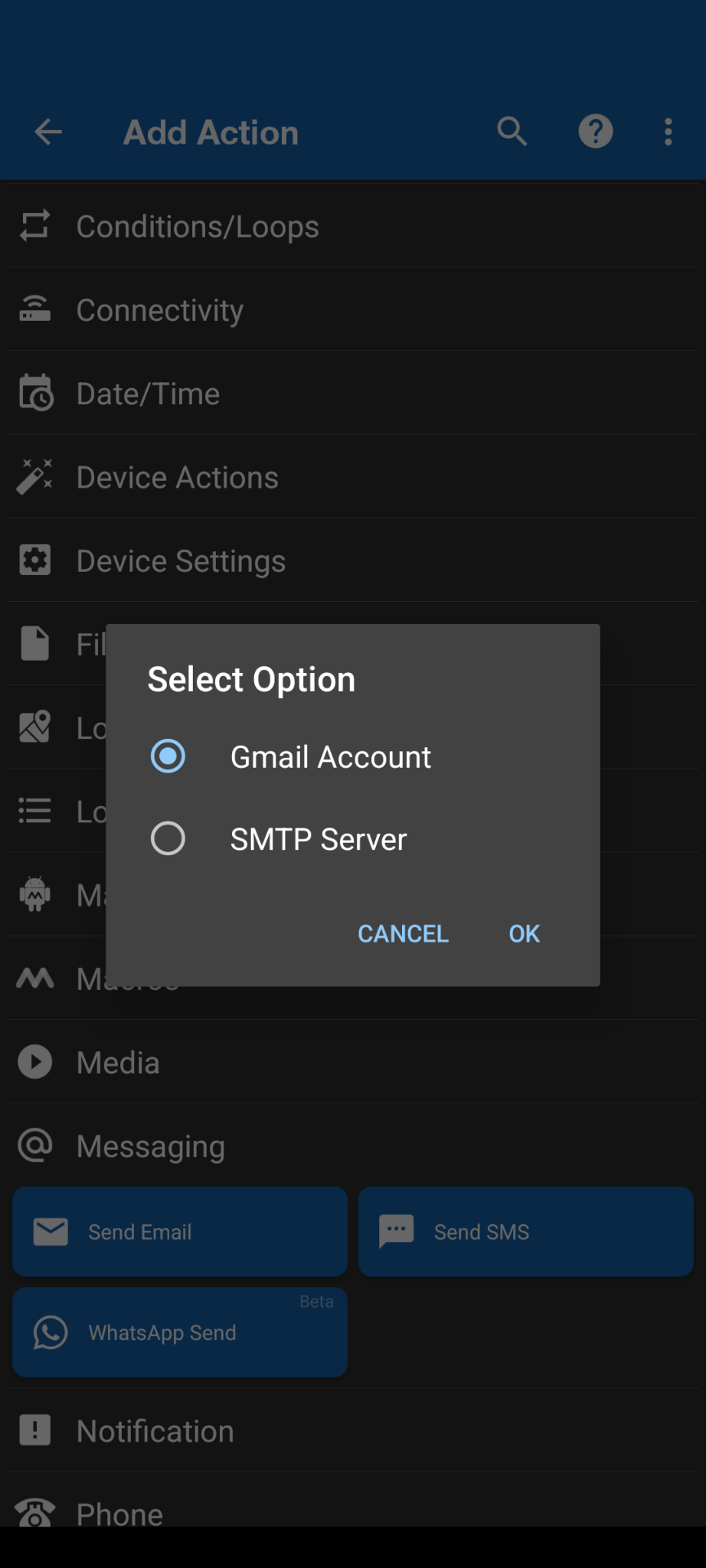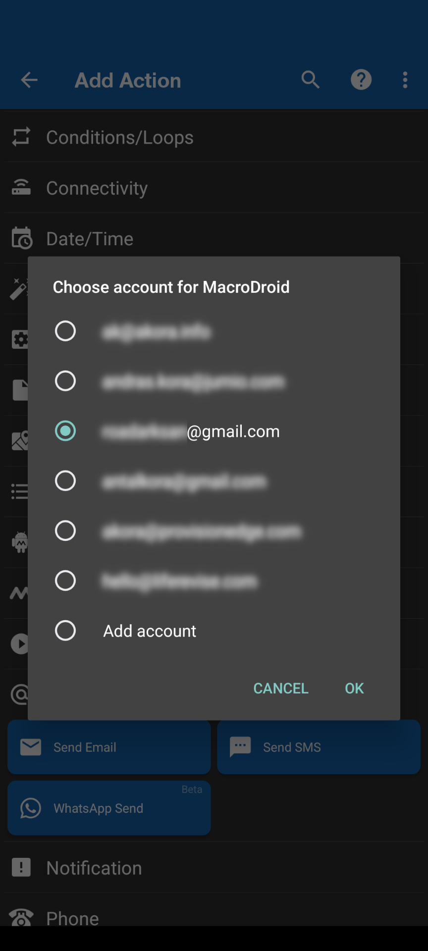 The next step asks if you are going to use a Gmail account to send that email. Remember that MacroDroid itself cannot send an email; it needs to use a proper account and send the email on behalf of that account. So, we select "Gmail."