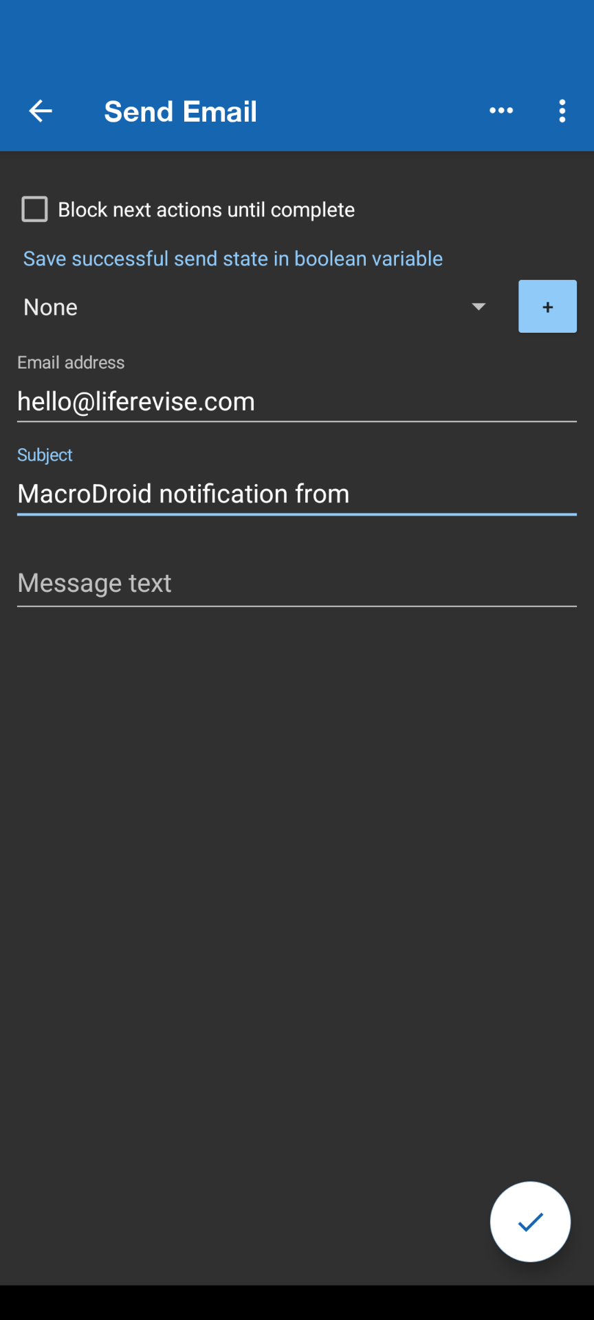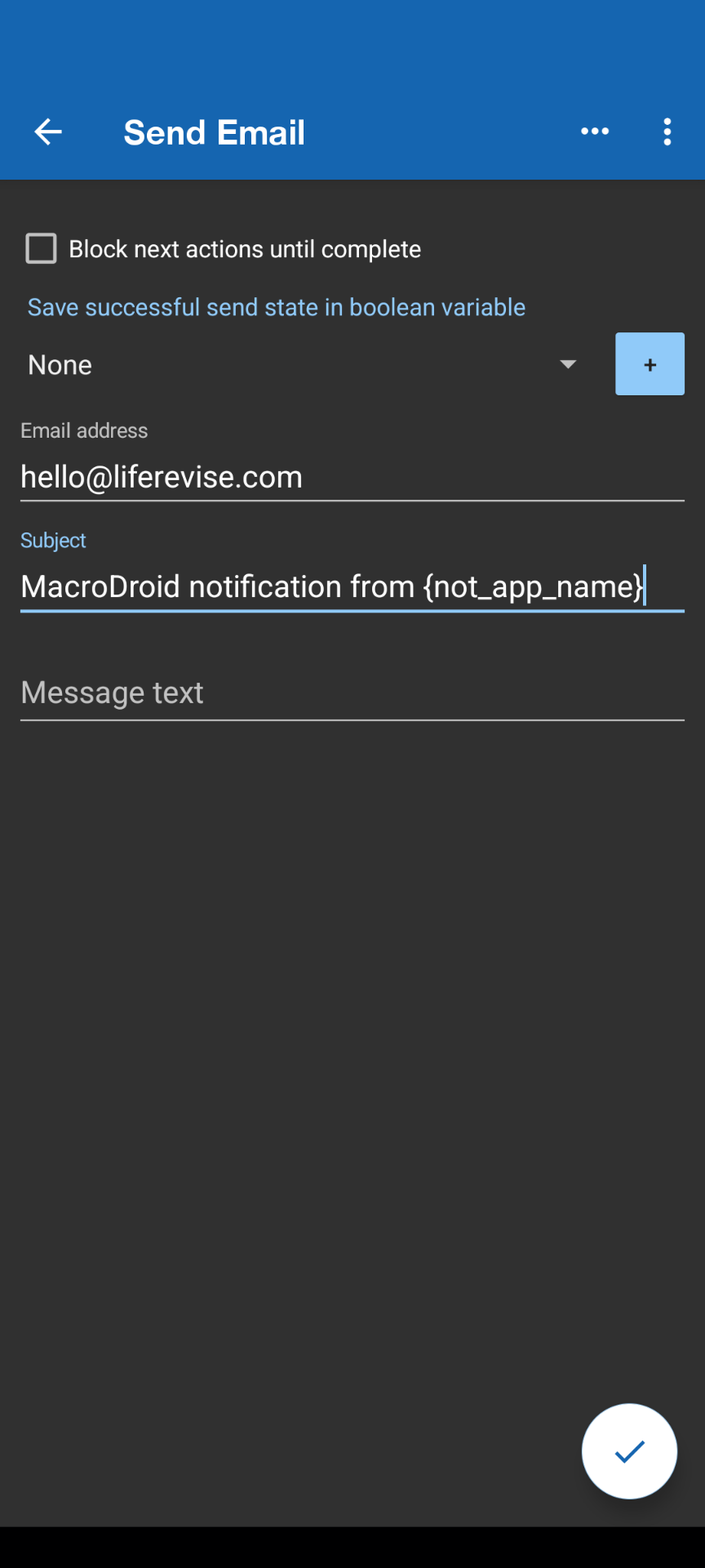 This is a very interesting step, and it's the most complex one, but it's still simple enough. The email address that you have to send the email to is going to be hello@liferevise.com The subject is going to be a text that I just added as the subject line of the email: "MacroDroid Notification from." But here, we are going to be smart and use a variable.