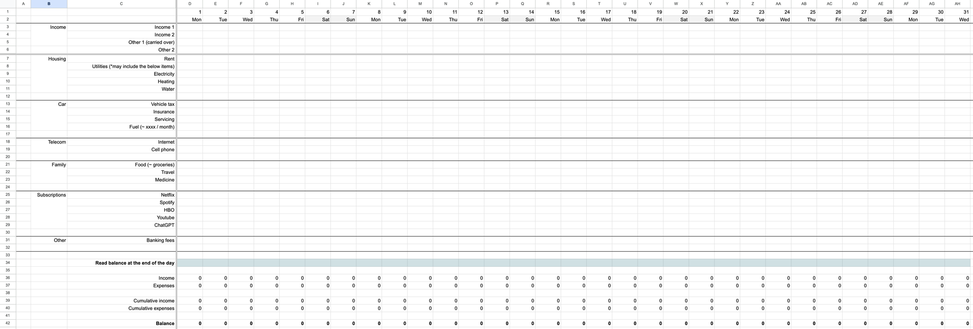 Then, you have to establish a daily routine when you fill in all the spending (and income) details for the actual day and also capture the "Read balance at the end of the day" value in row 34.